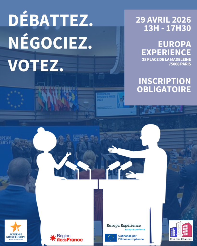 À l’occasion de la Semaine européenne de la jeunesse, l’Académie Notre Europe, en partenariat avec Cité des Chances, organise une simulation institutionnelle européenne le 29 avril 2026 (13h-17h30) !