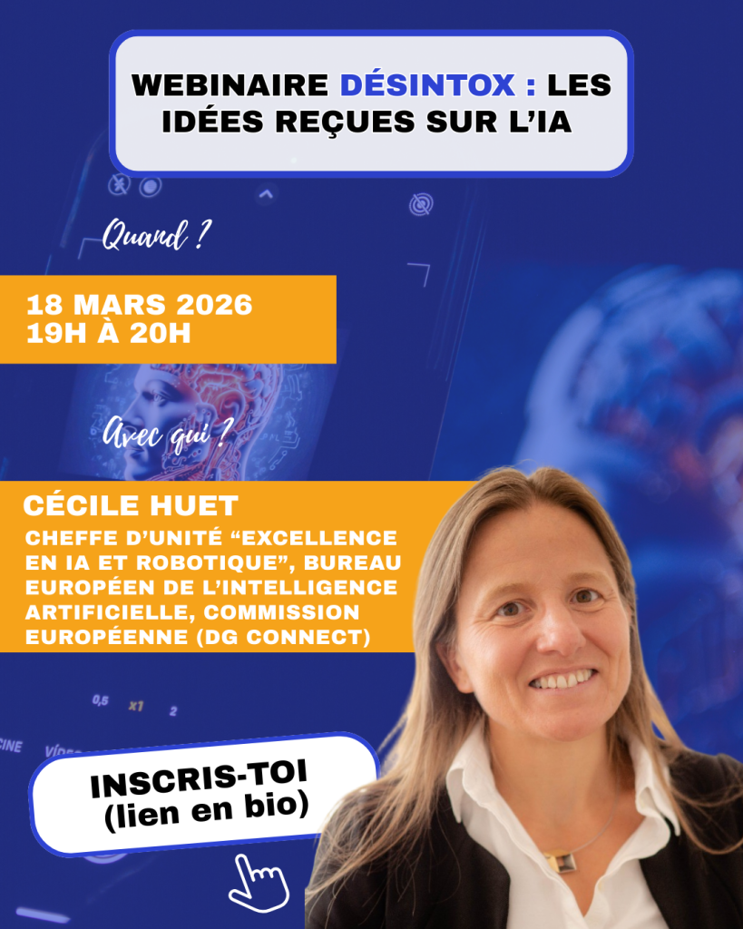 Nous vous proposons de nous rejoindre le 18 mars de 19h à 20h pour un webinaire désintox avec Cécile Huet, cheffe d’unité « Excellence en IA et robotique » au Bureau européen de l’intelligence artificielle de la Commission européenne (DG CONNECT).